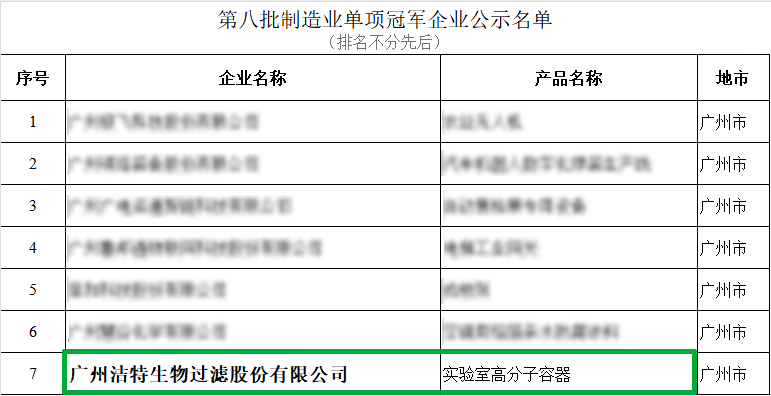 近日,廣東省工業(yè)和信息化廳發(fā)布了《第八批全國(guó)制造業(yè)單項(xiàng)冠軍企業(yè)》名單,廣州潔特生物過濾股份有限公司憑借生物實(shí)驗(yàn)室耗材關(guān)鍵核心技術(shù)和先進(jìn)生產(chǎn)工藝創(chuàng)新研發(fā)能力以及遙遙領(lǐng)先的市場(chǎng)占有率榮獲“制造業(yè)單項(xiàng)冠軍”。